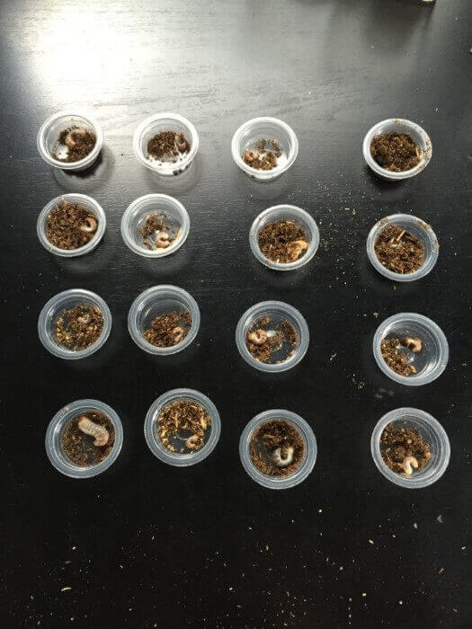 卵や幼虫が全く取れないと悔しいし、取れ過ぎても飼育に困るので、どの程度の産卵セットを組むか検討した結果こうなった(もう1セット組むため)。数としては狙い通り。
