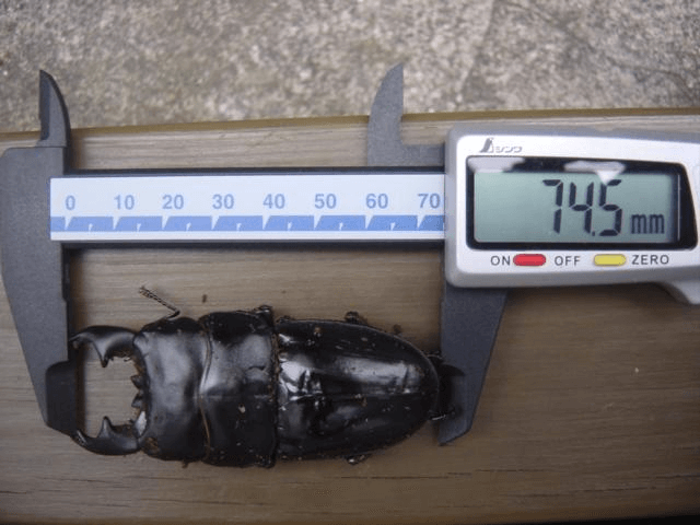 | 飼育期間・状態 | H20.11.3.初令割出しカワラ菌床400CCに投入。H21.5.3.3令800CCカワラ菌床に再投入。H21.6.20.3令1500CCカワラ菌床に再投入。体重35g♂H21.8.1.3令1500CCカワラ菌床に再投入。体重27gH21.10.蛹化確認。H21.11.下旬羽化。H22.5.5.掘出し採寸。74.5㎜ |