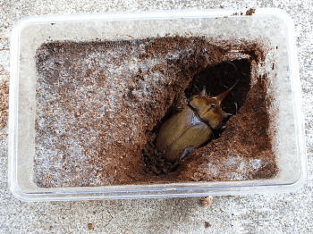 エレファス・エレファスゾウカブトが羽化しました。♂130㎜です。羽化までの詳細内容は以下のとおりです。<羽化までの内容>使用したエサ:きのこマット設定温度:25℃前後。エサ交換回数:交換約5~7回:小ケース使用羽化までの期間:約1年11ヶ月エレファス・エレファスです。今回も2年までかかりませんでしたが、それでもやはりゾウは長いですね。今回の個体は特大で130mmあります。これも小ケースでそのまま羽化させました。蛹室は狭い所に作りましたが、羽化不全もなく問題なく羽化しました。