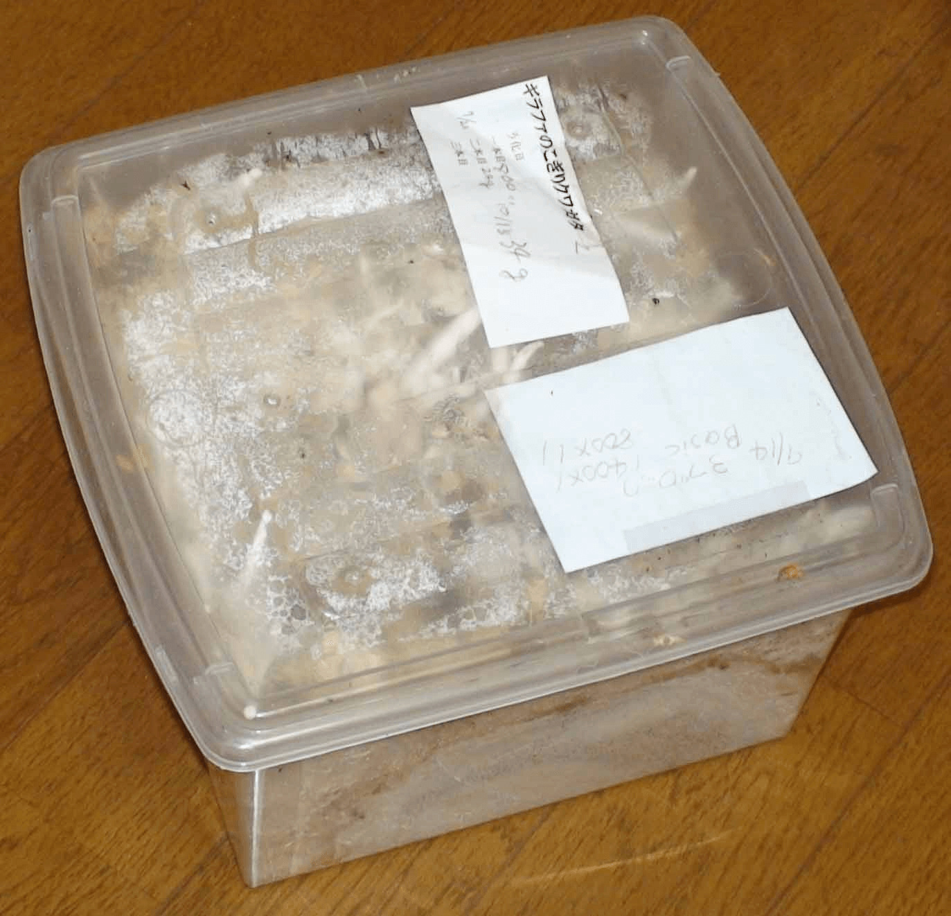 半年経ってもベーシックの菌糸はほとんど劣化がなく、他の虫の流用できそうなぐらいで、持ちがいいことが分かりました。でも、3000cc分がほとんど食べてもらえなかったのでもったいなくて残念です。今回が初めてのギラファの飼育で、♂の34gの幼虫が94mmぐらいになるという還元率の感覚がわかったことがよかったです。他には2本目で40g以上になっている幼虫もいて、現在(2012年3月)ほとんどの個体が蛹になっています。2本目に3000ccぐらいの大きな菌糸瓶に入れてそこで50gぐらいまでに成長させ、そのまま羽化させるのがポイントなような気がしましたね。