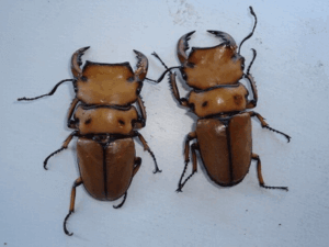 月夜野きのこ園さんのアンケートに回答し、プレゼントとして頂いたギラファです。1♂2♀で羽化しました。♀も50mmあります。ありがとうございました。<羽化までの経過>エサ:280ボトル→E1400→basic詰め替え2回温度管理:22~24℃(夏場は涼しい部屋の常温)羽化までの期間:おそらく9ヶ月(2令で頂いたので正確にはわかりません)