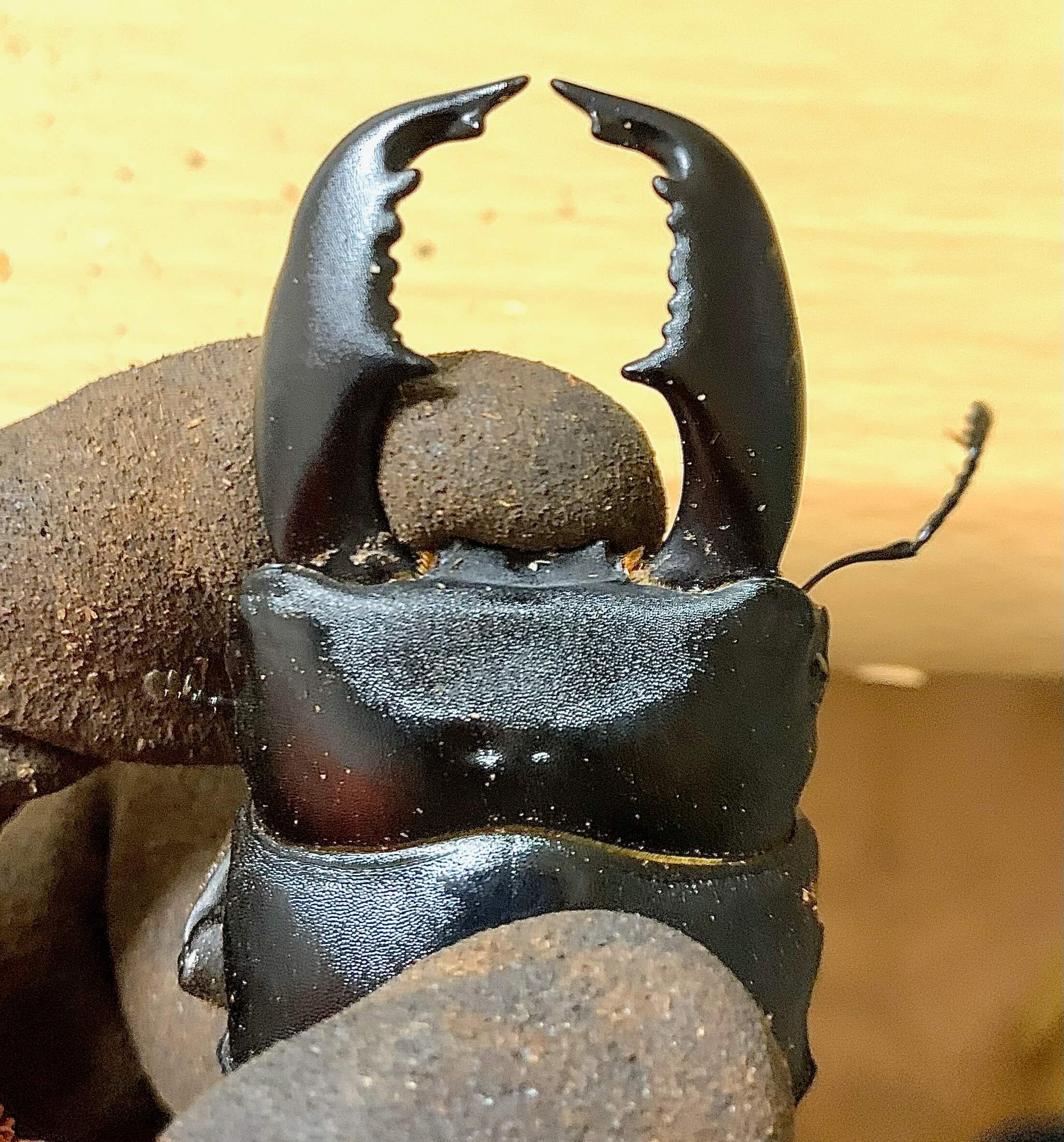 完熟マットで産ませて割り出した幼虫を2020年8月末~9月上旬にElement1400ボトルに初令投入。♀はそのまま羽化し、♂は2~3月にきのこマット1400ボトルに交換での2本返しです。Elementは1本目での引っ張りがそれなりに利き、オガが細かく吸収が良いのか60gまでは体重が乗ってくれました。WD93㎜の親は超えられませんでしたがかなりギリギリの蛹室だったので1400㏄では限界だったんだと思います。ネシア系ティタヌスは幼虫期間が短い傾向にあるそうなので、2本目で2L以上のボトルに粗オガ菌床を使えば良いのかな、という感想です。親は内歯上がりでしたが羽化した♂6頭の内この個体も含めて2頭が内歯中間でした。