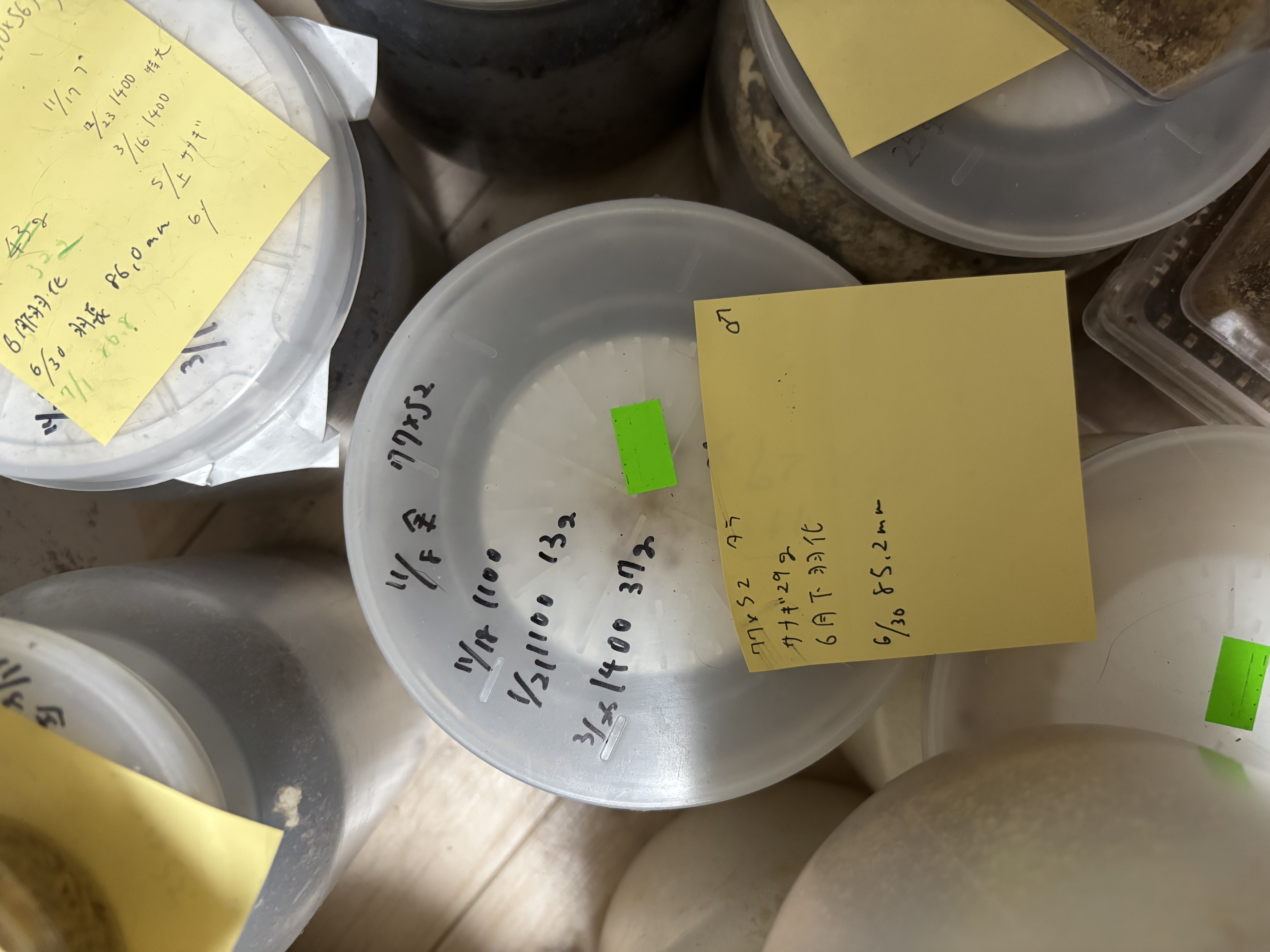 | 飼育期間・状態 | 2024年11月8日 孵化、産卵1番にてマット管理 2024年11月18日 1本目既製品ナチュラ1100ボトルへ初齢投入 2025年1月21日 2本目既製品ナチュラ1100ボトル投入(幼虫体重13g) 2025年3月25日 3本目既製品ナチュラ1400ボトル投入(幼虫体重37g) その後蛹室作りまで放置、6月初めに露天掘りで蛹化確認、6月下旬羽化 |