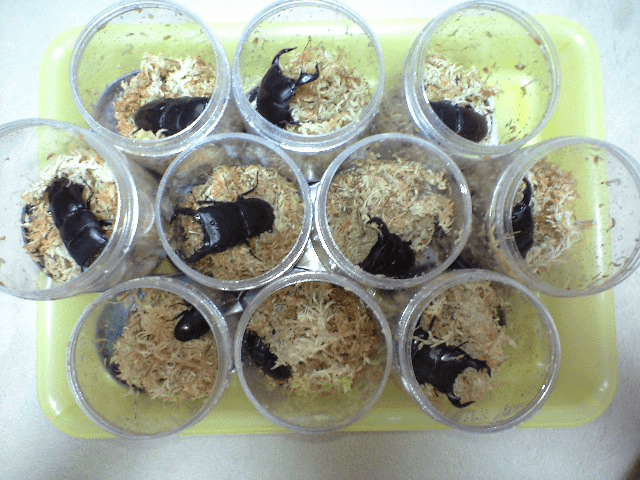 某ショップのオークションでスマヒ(アチェ産)として購入し、大事に育て羽化を心待ちにしていた。以前飼育したスマヒ(リアウ産)よりも幼虫の成長に伸びが無くこんなものかと思っていた。2008/3に試しに掘り出してみると顎の形状がスマヒと明らかに違。不審に思いその日の内に羽化したと思われる全てのボトルを掘り出すと何と出てきたのは全てダイオウヒラタであった。