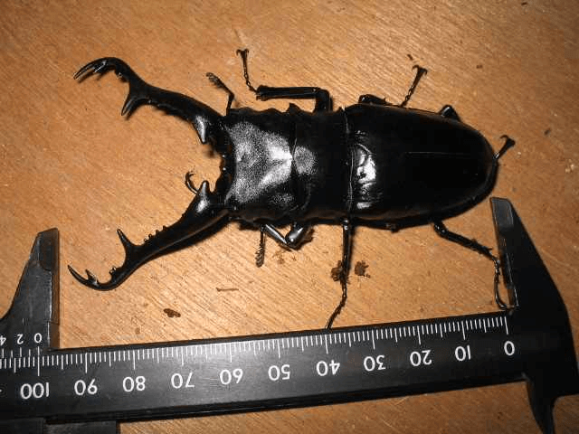 多くの幼虫を飼育しましたが殆どが90ミリ台で100ミリに届いたのはこの1頭だけです。大アゴの湾曲が格好良いと思います。