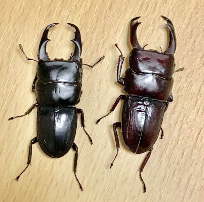 しかし♂49㎜は左顎ズレ(体長は右顎で計測)、左上翅縮み、ディンプル多数と可哀想な結果となり、完品の♂は最大で46㎜でした(画像②左個体)