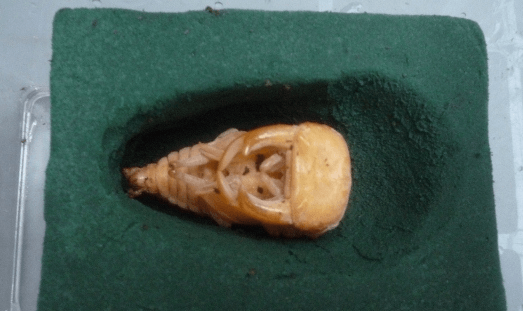 | 飼育期間・状態 | 5/22 菌床産卵セットに♀投入6/28 1本目、エレメント800ccへ初齢幼虫投入10/2 2本目、エレメント800ccへ三齢幼虫投入2/26 3本目、エレメント1100ccへ投入 幼虫24g6/19 菌糸劣化のため、人工蛹室へ移動 蛹体重19g |