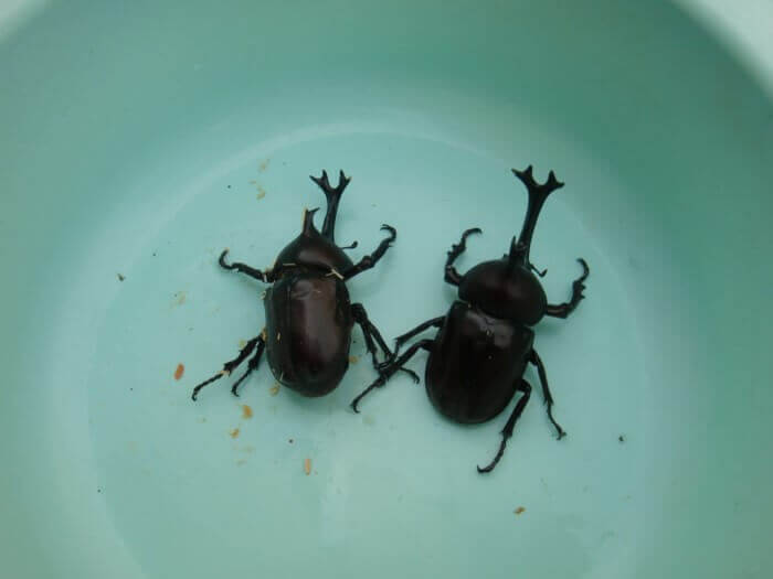 常温飼育で廃マット、廃菌糸、新品きのこマットを半分ブレンドした雄です(写真上と下の右)。温度管理した物より2ヵ月遅れの7月初旬にほとんど羽化しました。明らかに廃マットのみより一回り大きく羽化しました。
