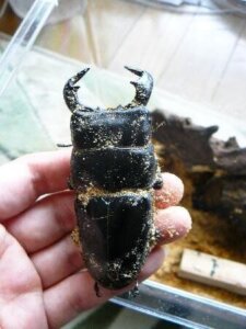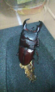 2012年夏に羽化した6頭のうちの1頭です。以前産卵レポートでも紹介させて頂いたものです。2013年6月にボトル越しに全て羽化していることが確認できましたが、2014年春までそのまま休眠させ、万を持して掘り出したものです。内訳は♂64ミリ、62ミリ、♀38ミリ、37ミリ、36ミリ(もう1頭は♂でしたが死んでいました。立派な大顎だったのですが・・)でした。